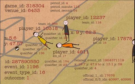 - Action ID (loại hành động nào): 16 – một bàn thắng (có khoảng 80 loại khác nhau, ví dụ như 1 – Passing, 3 – Dribble, 13 – Off target,… Mọi hành động có thể xảy ra trên sân bóng đều đã được mã hóa);